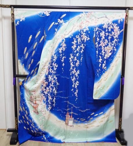 4.  > 大振り袖 背の高い人用振袖 青地に緑の流星サクラとだんじり入り 80年代流行の着物