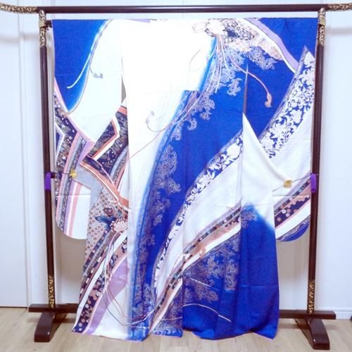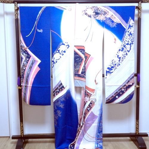 青の生地に白の流星が流れていて、すらっとした印象与える大振り袖。