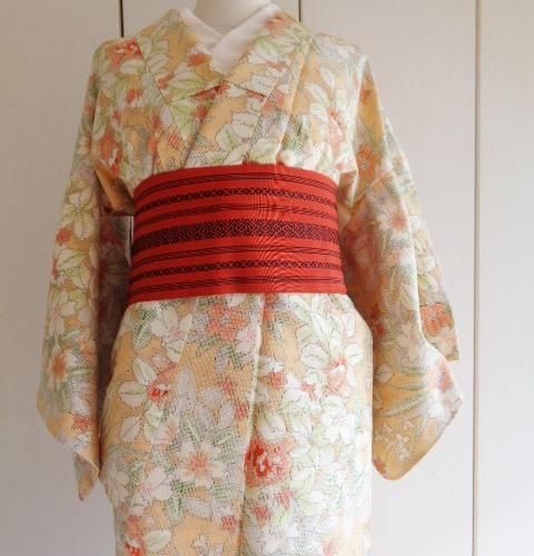 鮮やかな朱色で、無地の着物や、小紋、浴衣などによく映えると思います